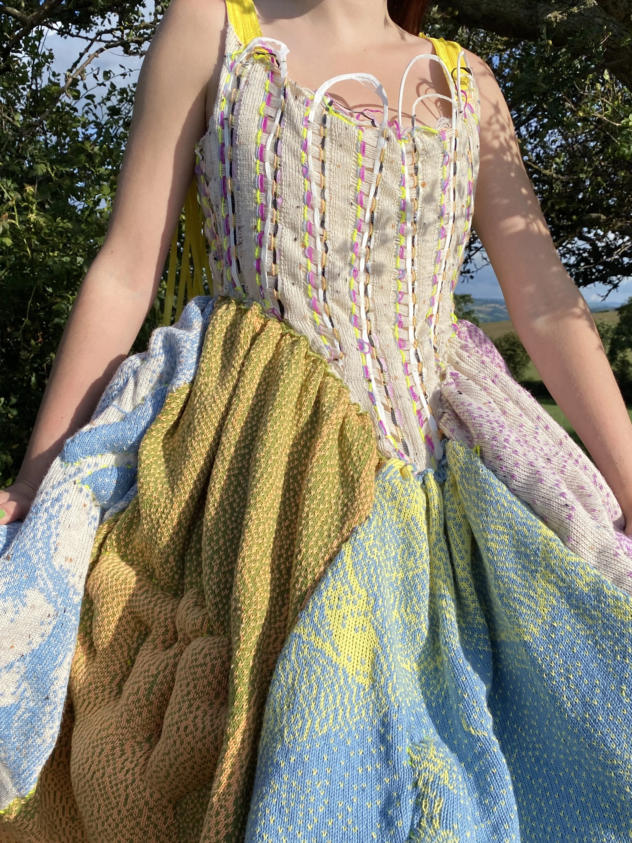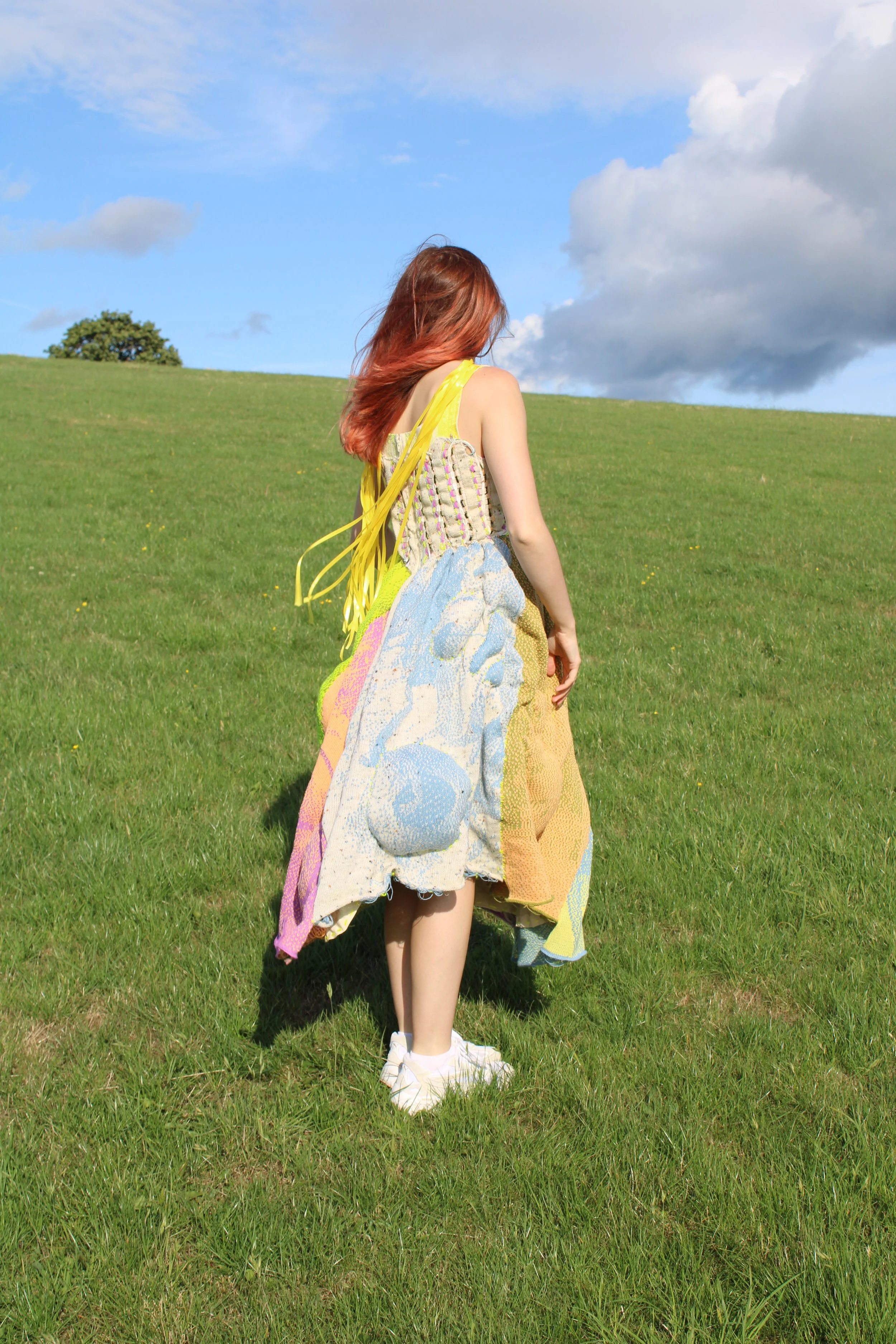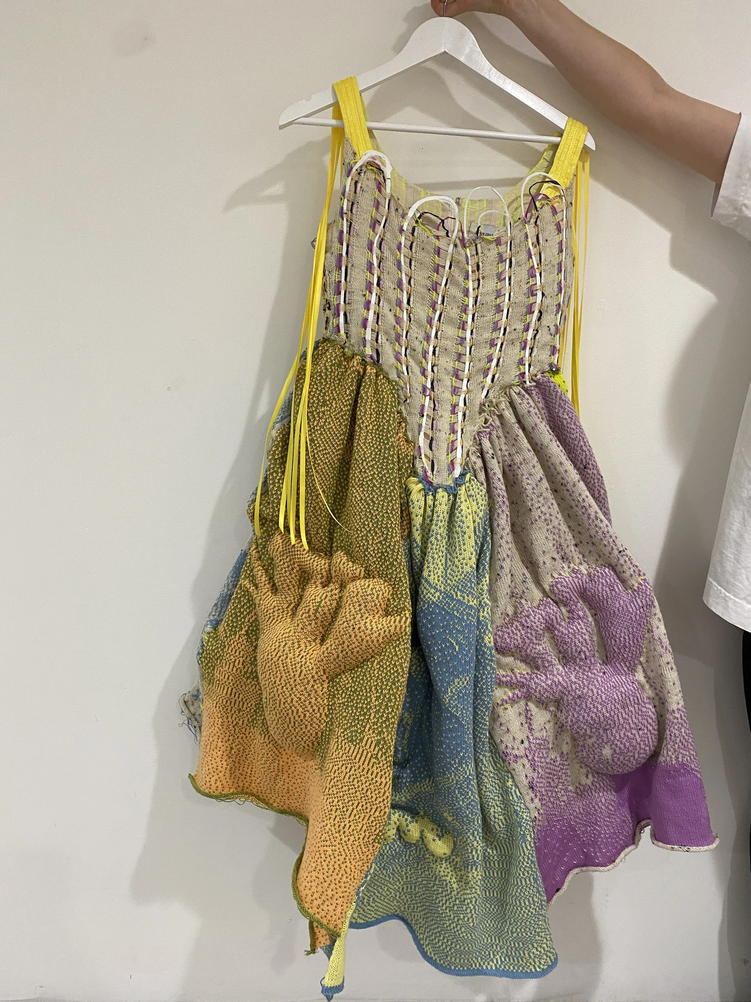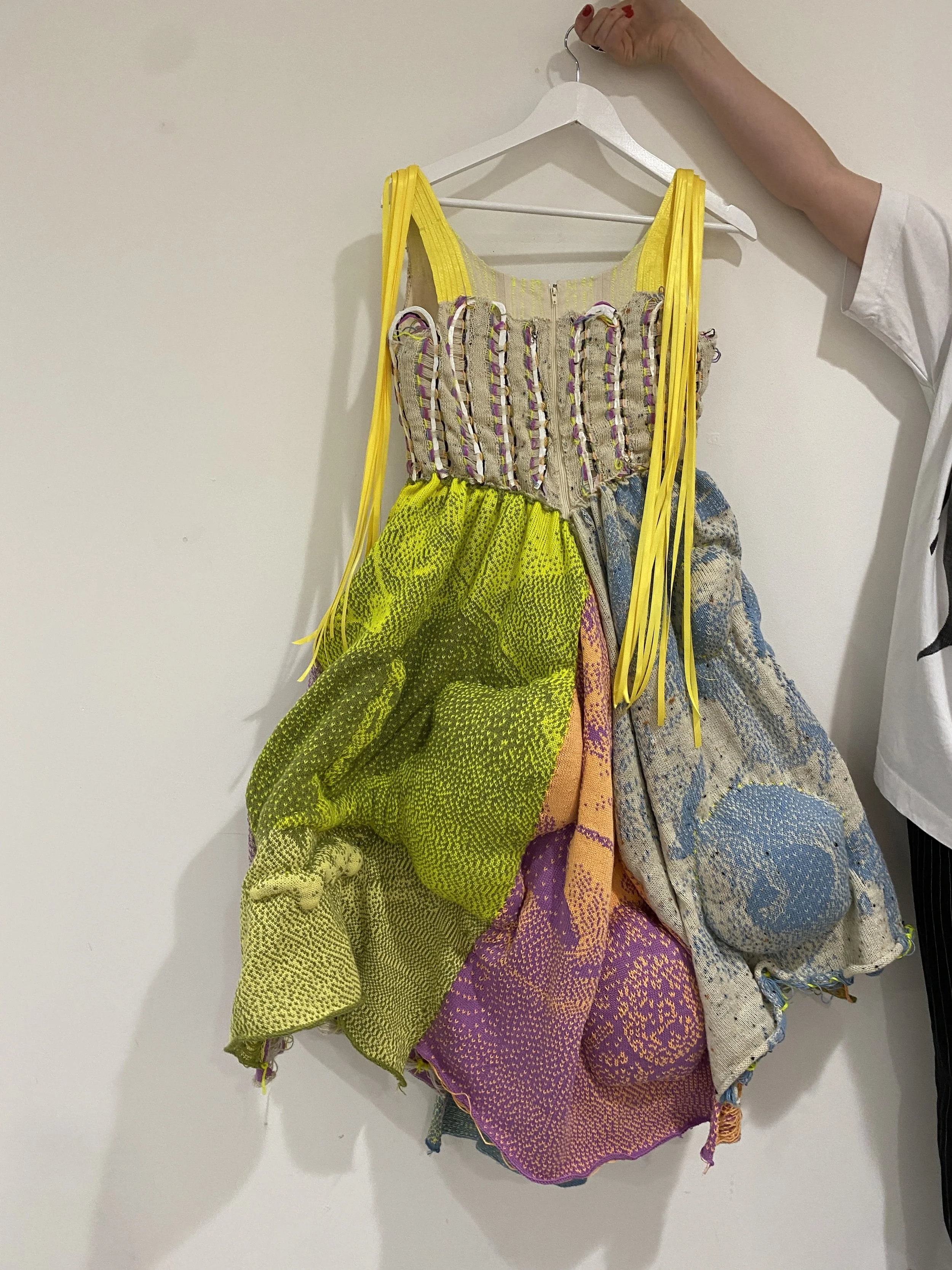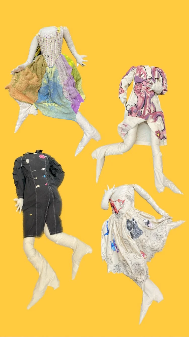 ‘Bridging the gap between Fine Art and Fashion, Ríon Hannora (@rionhannora) creates wearable art. With nods to both the baroque era and urban graffiti there is often a juxtaposition throughout her collections. The act of collaboration is also often found in her work and this exhibit is not an exception to that. Bringing neighbouring countries together through this amalgamation of fashion and fine art was a goal from the very beginning and so, Ríon reached out to three Welsh artists and two Irish artists to collaborate on this project; Ffion Evans, Aisling Phelan, Morgan Dowdell, Osian Efnisien and Amelia Greham. Evans, Phelan, Dowdell and Efnisien were given a garment each, made by Ríon in her Dublin studio to explore their own practice through the use of clothing. Each artist was given just over a month to make this blank canvas of a garment, into something else entirely. All the while, Amelia Greham created the mannequins in which these garments are displayed.’ - Ríon Hannora